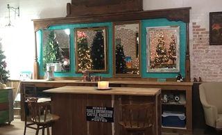 This "saloon" was once a bed frame ...headboard, side-rails and posts surround these mirrors for an old-time saloon look.