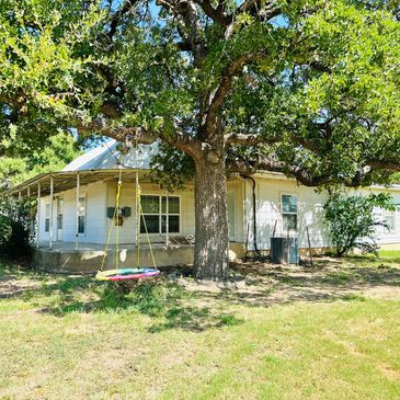 3 Bed 2 Bath 1,857 Sq Ft house on a corner lot with large yards, mature Post Oaks, and a chain link fence around the entire property.